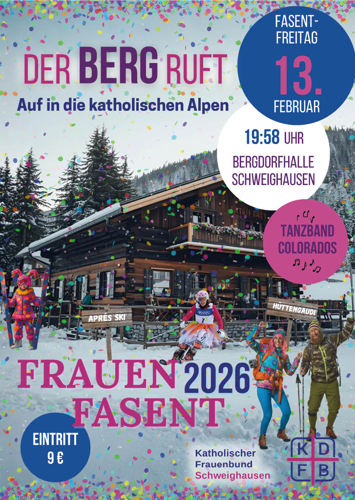 Am 13.02.2026 starten die Frauen in der Bergdorfhalle in Schweighausen mit einem bunten Programm in die katholischen Alpen zur Apré Ski-& Hüttengaudi. Beginn: 19.30 Uhr. Eintritt: 9 Euro. Weitere Infos: https://www.frauenbund-freiburg.de/aktuelles/berichte-aus-den-zweigvereinen/zweigverein-schweighausen